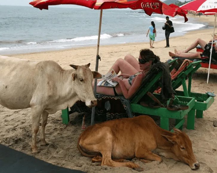 Stell dir vor, du entspannst unter der sanften Sonne Goas, das sanfte Rauschen der Wellen im Ohr, und neben dir zwei Kühe? Ja, richtig gelesen! Hier teilen sich entspannte Urlauber den Sand mit den echten Lokalstars, den Kühen. Auf unserem Foto sieht man eine Touristin, die es sich unter einem Sonnenschirm gemütlich gemacht hat, unbeeindruckt von ihren zwei neuen, ungewöhnlichen Nachbarn.