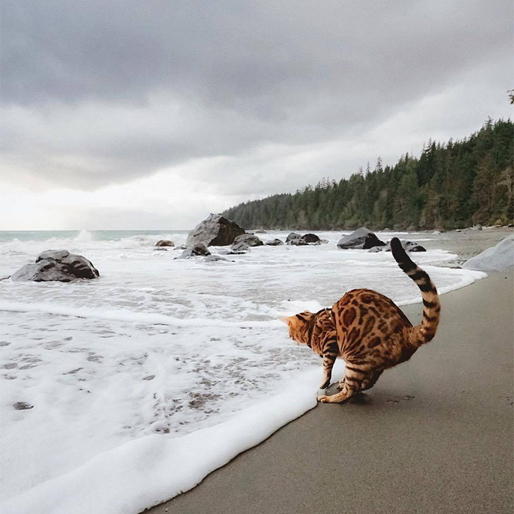 Stellt euch vor: Eine mutige, vielleicht bengalische Katze erkundet das unbekannte Terrain des Strandes. Mit weit aufgerissenen Augen beobachtet sie fasziniert das Hin und Her der Wellen. Doch als eine freche Welle es wagt, sich ihr zu nähern und droht, ihre zarten Pfötchen zu benetzen, zeigt sie ihre wahre Natur.