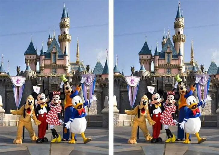 The resort holds several attractions, but the jewel in the crown is the Sleeping Beauty Castle. This time, Princess Aurora or other characters from Sleeping Beauty aren’t in view. Instead, Mickey Mouse, Minnie Mouse, Donald the Duck, Goofy, and Pluto pose in front of the legendary castle. There’s just one difference between the pictures!