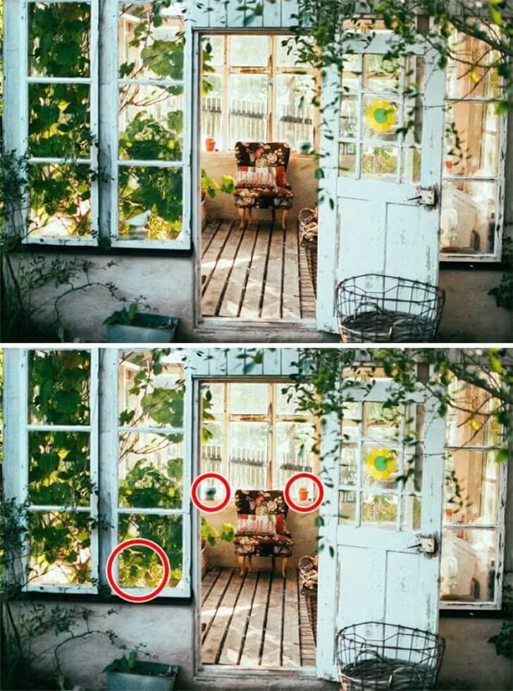 We hope you didn’t spend time studying the patterns on that chair because this one was surprisingly easy. At least, the first two differences. Can you see the flower pots on the window ledge by the side of that chair? Of course! Do you notice how one’s green and the other’s orange? In the second photo, their positions are interchanged.
