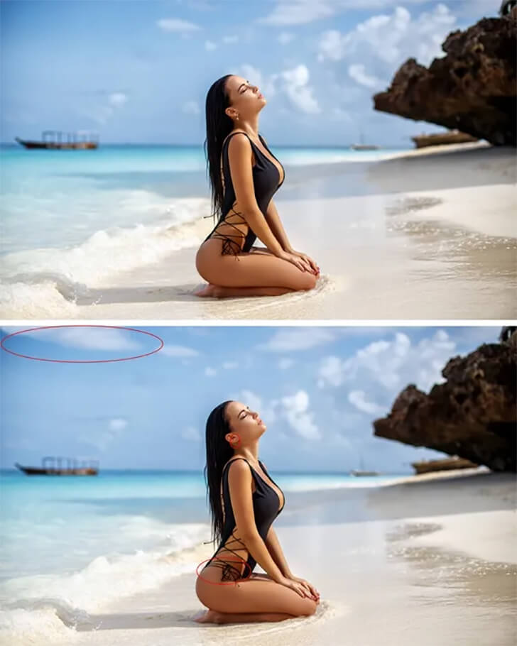 Next, we move to the star of the picture. The second difference we can see is her earrings. In the first picture, she has one worn. But in the second frame, it appears she’s ditched it. Last but not the least, her swimsuit. After you compare the strings near her waist, you should notice an extra string.