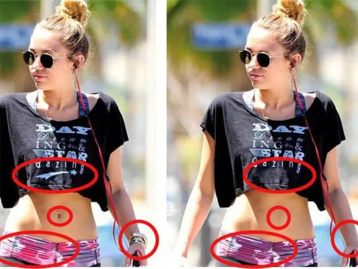 Hopefully, you weren’t too distracted by the marvel that is Miley Cyrus that you failed to pinpoint the four differences that set both photos apart from each other. The first thing we noticed is that her belly button is noticeably absent in the second photo.