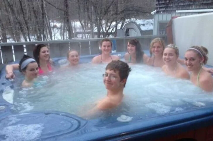 Who says being a nerd doesn’t come with its perks? Picture a young man, glasses and all, seemingly plucked from the quiet corners of a library and dropped into the steamy, bubbly world of a hot tub—surrounded by eight girls no less. It’s like a scene from a teen movie where the underdog ends up in the spotlight, proving that sometimes, stereotypes get delightfully flipped.