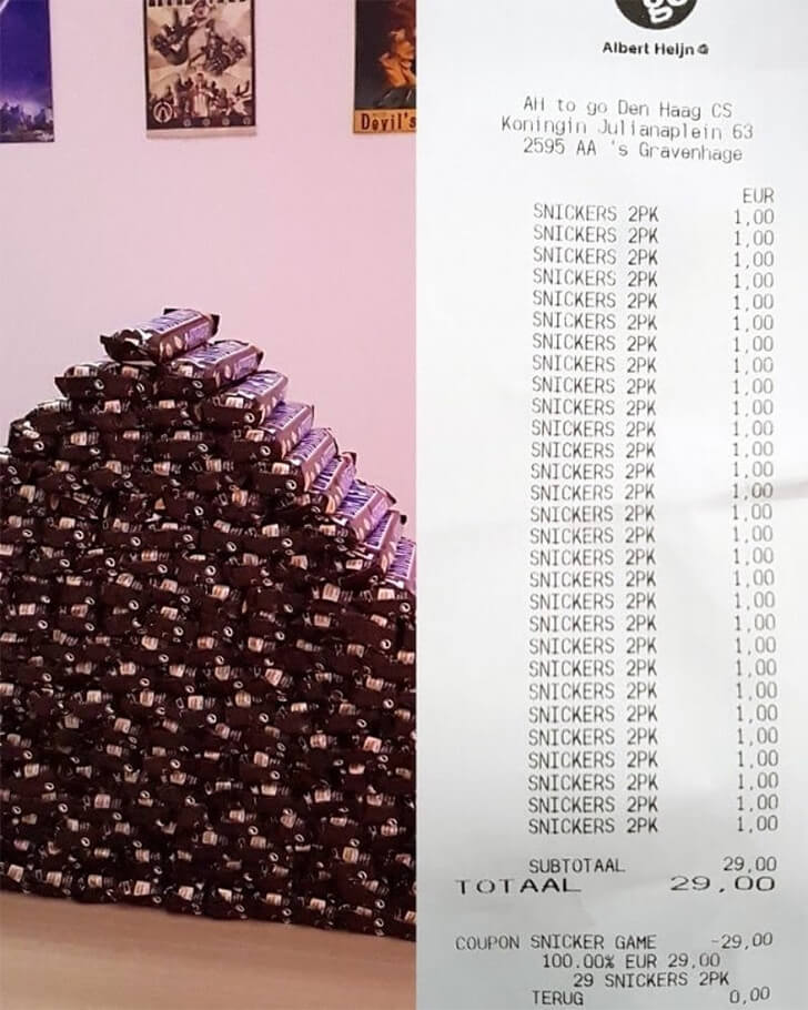 But at checkout, the universe had a sweeter deal in mind: the coupon glitched, granting a 100% discount on the entire batch! That’s right, a whole Snickers cart is absolutely free. The receipt proudly displayed in the photo, shows a total of $0.00—now that’s a delicious twist of fate!