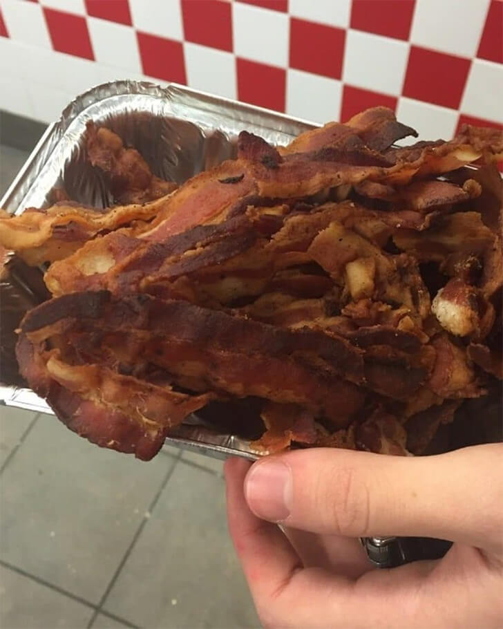 Five Guys is known for its handcrafted burgers, heaps of golden fries, and the liberty to choose from multiple toppings—making each visit deliciously unique. But a basketful of bacon on the house? That’s a rare treat that would make any bacon lover’s day. The photo of this customer’s bacon loot just says it all.