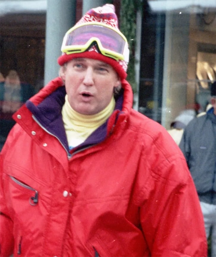 Captured on the streets of Aspen, Colorado, in December 1992, this photo showcases a style perfect for winter leisure rather than the ski slopes. Wrapped in a red ski jacket complemented by a colorful beanie and a purple-yellow neck gaiter, Donald exudes a casual winter vibe as he enjoys the chilly ambiance.