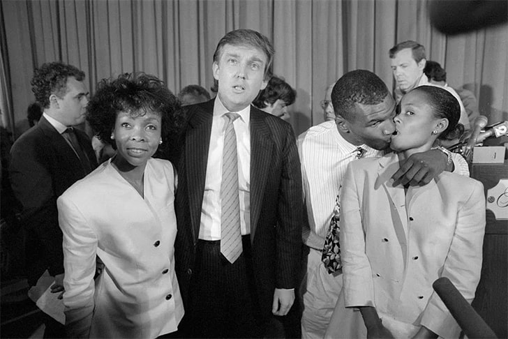 Captured in a uniquely candid moment on July 12, 1988, during a press conference in New York, this photograph features heavyweight champion Mike Tyson sharing a tender kiss with his wife, Robin Givens. By their side on the left, Robin’s mother, Ruth Roper, and Donald Trump witness this intimate display.