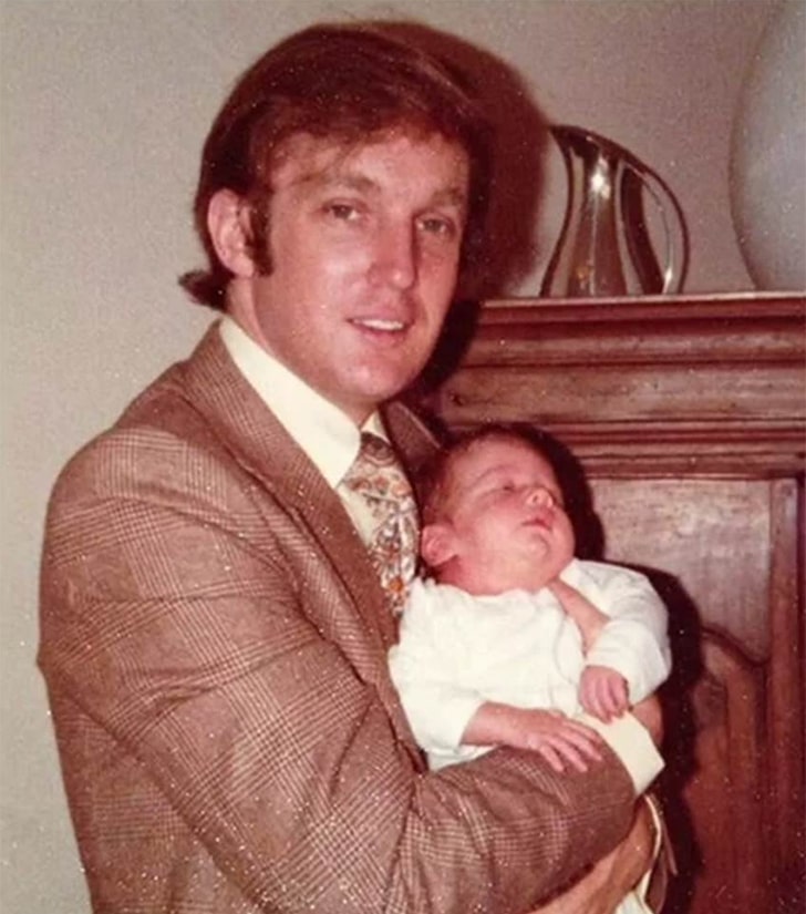 In this heartwarming throwback, a young Donald Trump holds his newborn son, Donald Trump Jr., who was born on December 31, 1977. The future president looks both proud and ecstatic as he cradles his first child, a moment of genuine tenderness that shows a softer side often overshadowed by his public persona.