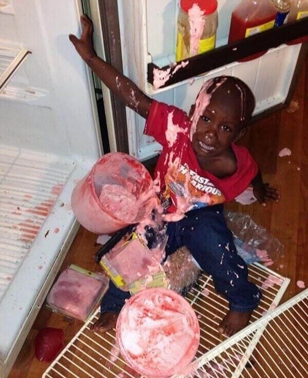 A kid seems to have met a frosty fate, buried under the freezer’s contents with ice cream smeared all over him. Judging by the scene, he probably tried to sneak a scoop well past his bedtime.