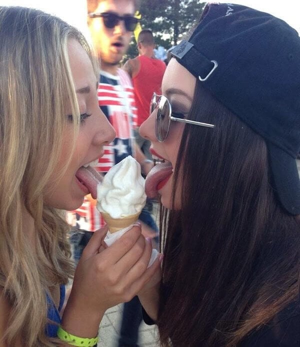 Two girls are trying to share a single ice cream cone, their tongues touching the ice cream at the same time. In the background, a man with sunglasses is caught with his mouth slightly open, his surprised expression revealing he has just witnessed this intimate yet funny scene.