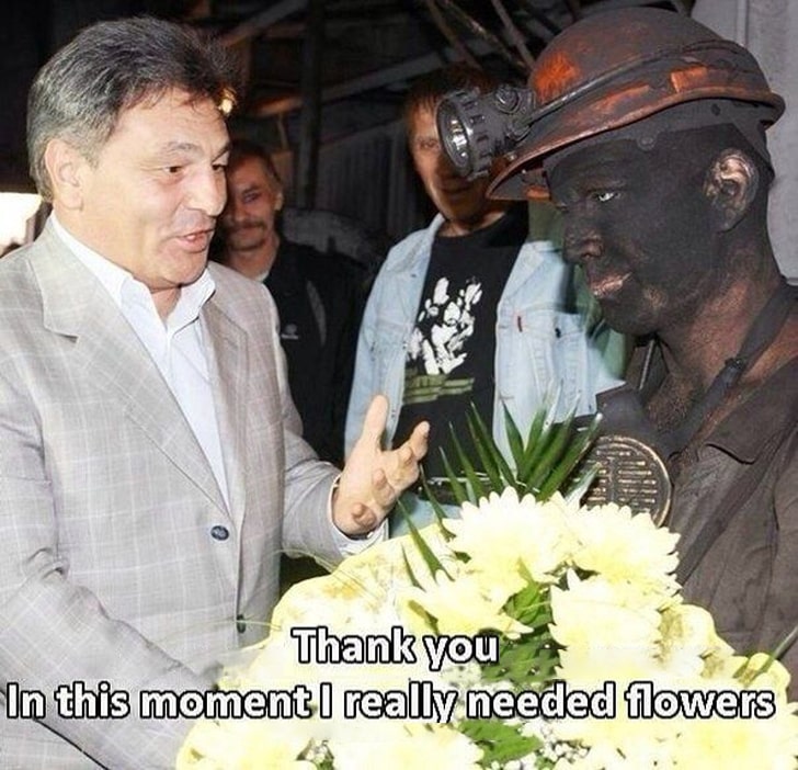 Perhaps he was trapped in a mine collapse or a dramatic escape from a coal seam (a layer in the earth holding and producing gases like methane.) Either way, he’s got that “just walked through a chimney” look going on. The flowers, though well-intentioned, seem as out of place as a Starbucks in Middle Earth. Maybe a cold drink and a shower would have been a better choice!