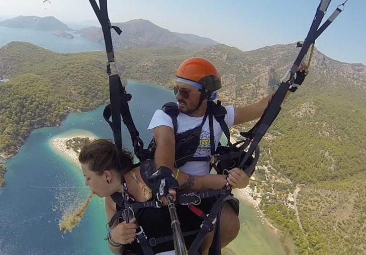 A woman is paragliding with an instructor, and his expression shows clear disappointment as she vomits mid-flight. Despite the breathtaking scenery below, she’s too overwhelmed to enjoy the experience. She likely ate a bit too much before taking to the skies, leading to this airborne mishap.