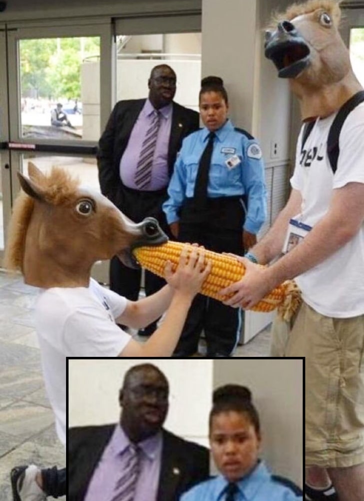 Two people wearing horse-head masks create a truly bizarre scene in an airport security area. One kneels, holding a large cob of corn in its mouth, while the other stands, grasping the other end. The positioning makes the whole act look quite inappropriate for public viewing.