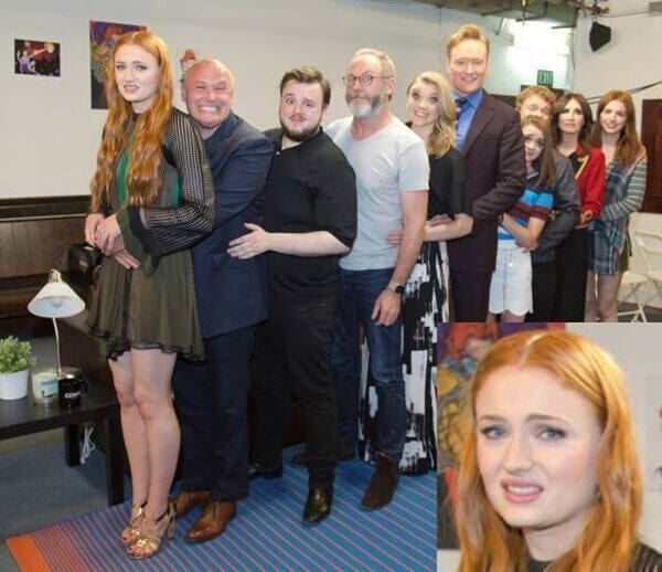 It’s our favorite “Game of Thrones” cast in this amusing snapshot. Varys, played by Conleth Hill, has his arm around Sansa Stark, a.k.a. Sophie Turner, at a promotional event with Conan O’Brien. The Queen of the North’s expression suggests she is eager to escape his grasp.