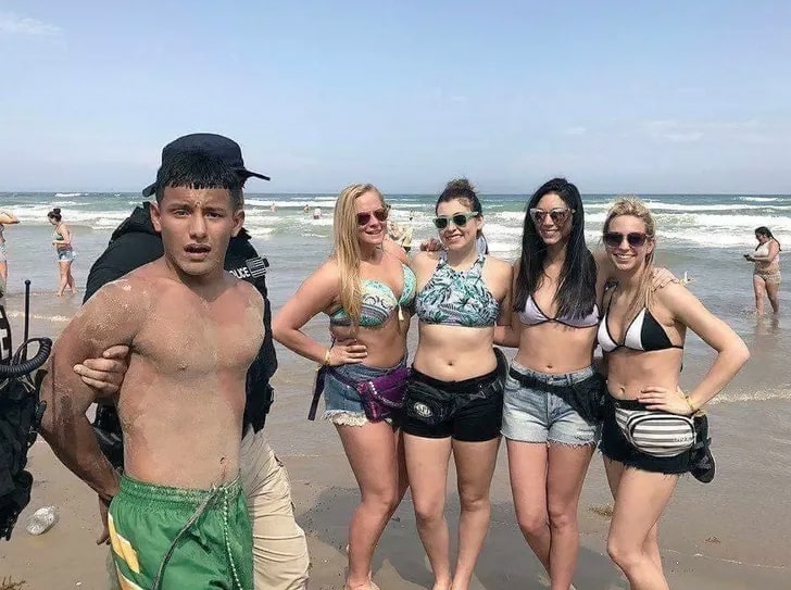 Four girls at the beach are enjoying a sunny day, posing for what should have been a perfect moment. Suddenly, a man, handcuffed and escorted by police, strolls right through their setup. The man’s expression steals the scene—his eyes wide with surprise and a hint of embarrassment that there’s now photo evidence of his brush with the law.