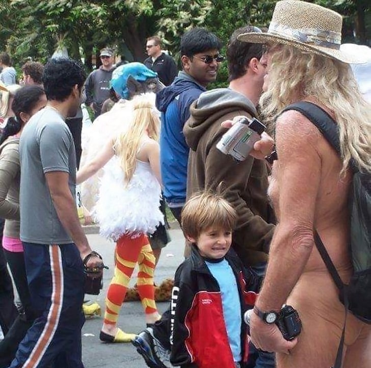 In this bizarre and unexpected scene, a kid at a public event stumbles upon a man wearing only a backpack and a hat while sipping from a flask. The child’s face is a mix of sheer terror and utter confusion, clearly not prepared for such an unusual sight.