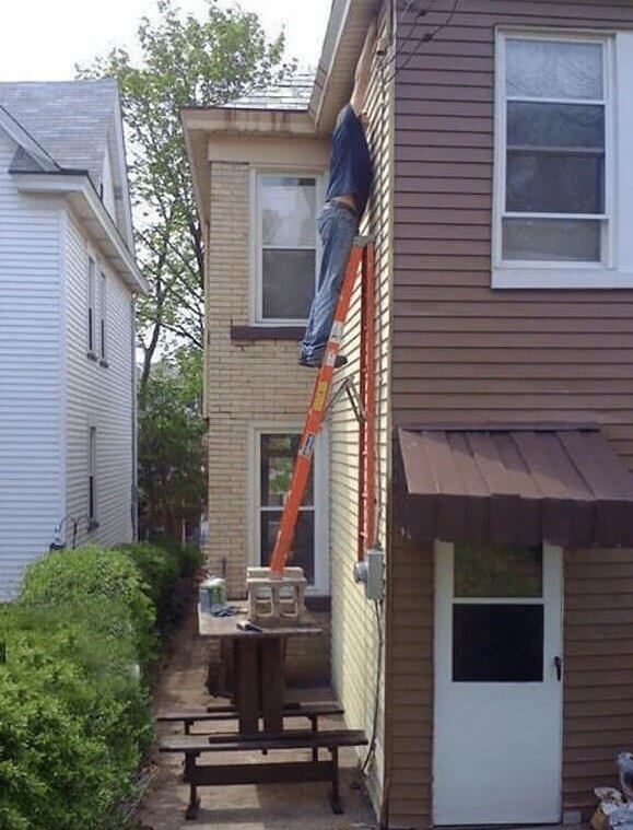 Construction workers and professional contractors have all the necessary tools and equipment to get the job done, but this DIYer decided to take a more adventurous route. Faced with a roof repair, he realized his ladder wasn’t long enough to reach the second story. So, what did he do? He balanced the ladder on a haphazard stack of benches, cinderblocks, and whatever else he could find.