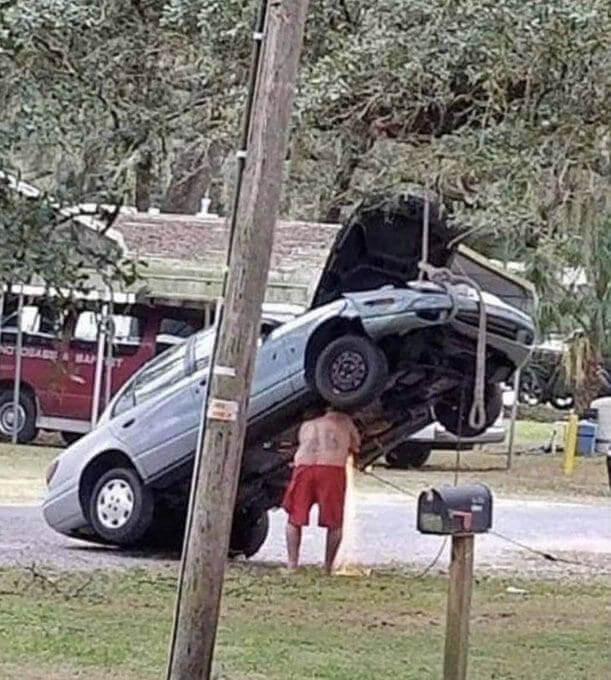 The front of the car is now bent, and the tree looks like it’s ready to snap, posing a serious risk of a calamity. It’s a risky move that seems straight out of a “Looney Tunes” episode! This precarious setup might work in cartoons, but in real life, it’s a recipe for disaster.