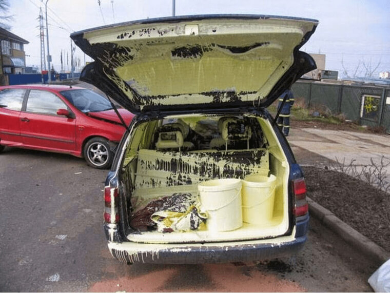 A DIY enthusiast’s paint project made quite a splash—literally! Loading up the car with two giant white paint cans, they must have missed a crucial detail: securing the lids. One tiny bump in the road or a sudden brake, and their trunk became a canvas for an impromptu art exhibit.