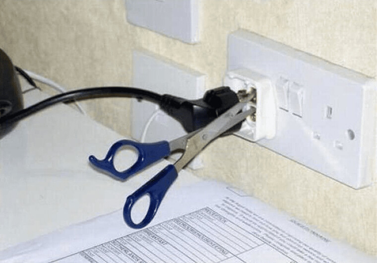 They created a makeshift solution that screams disaster by jamming scissors into the outlet. This hair-raising hack turns a simple plug problem into a potential fire hazard. One flip of the switch, and they might as well be prepping for a fire drill. Electricity and scissors don’t mix—unless you’re looking to add some sparks to your life, quite literally!