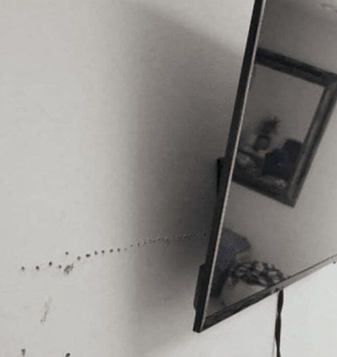 How hard can it be to wall-mount a flatscreen television on your own? Judging by this picture, it’s a bit of a comedy of errors! The wall looks like it’s been in a wild west shootout, riddled with screw marks from attempts to get the TV just right. After what must have been a marathon of trial and error, the TV is finally hanging straight—hallelujah!