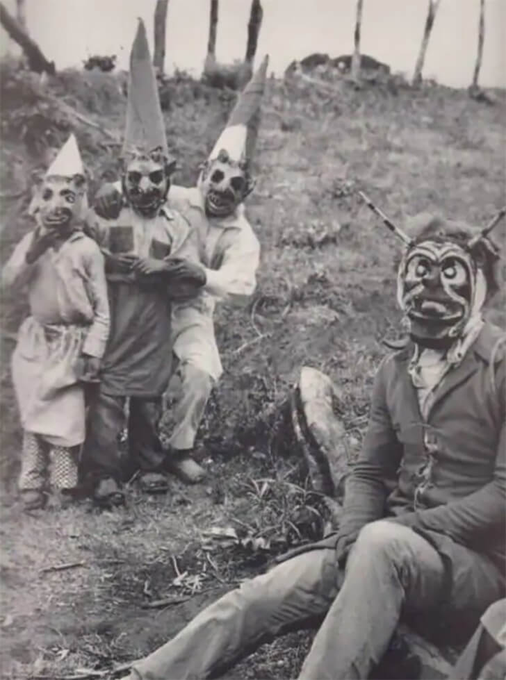 But it’s their father, seated before them, who truly unnerves. Adorned with an unusual mask that defies description, he is the enigmatic centerpiece of this eerie family portrait. His disguise is so otherworldly that it challenges the boundary between fantasy and reality, leaving us to ponder the unsettling secrets lurking behind these convincing costumes.