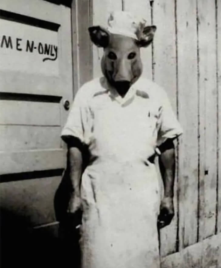 A mysterious figure emerges from the shadows in a haunting snapshot that’s enough to bring upon nightmares. Cloaked in an eerie pig mask and a stark white apron, this enigmatic man stands resolute before a wooden door conspicuously marked “MEN ONLY.” The mask obscures his features, shrouding his identity in a veil of unsettling anonymity.