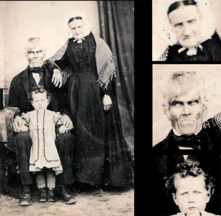In what initially appears to be an ordinary family photograph, an unsettling twist awaits those who dare to scrutinize it closer. The mother, father, and their child huddle together. Yet, as you zoom in, a chilling revelation materializes—their irises, the windows to the soul, are conspicuously absent, replaced by vacant, ghostly white orbs.