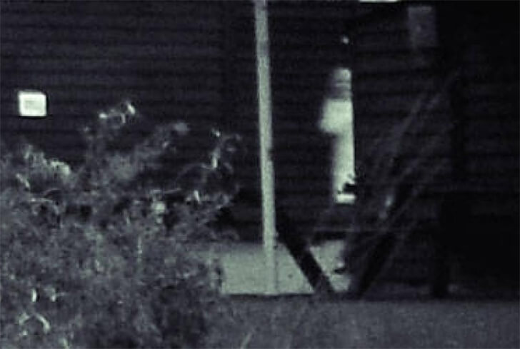 In the heart of the night, a spectral apparition takes center stage within the grainy confines of a sinister photograph. A moonlit house provides the backdrop, its darkened silhouette contrasting sharply with the otherworldly presence lurking. In the shadows, a ghostly woman materializes there, her ethereal visage half-hidden as she peeks from behind the structure.