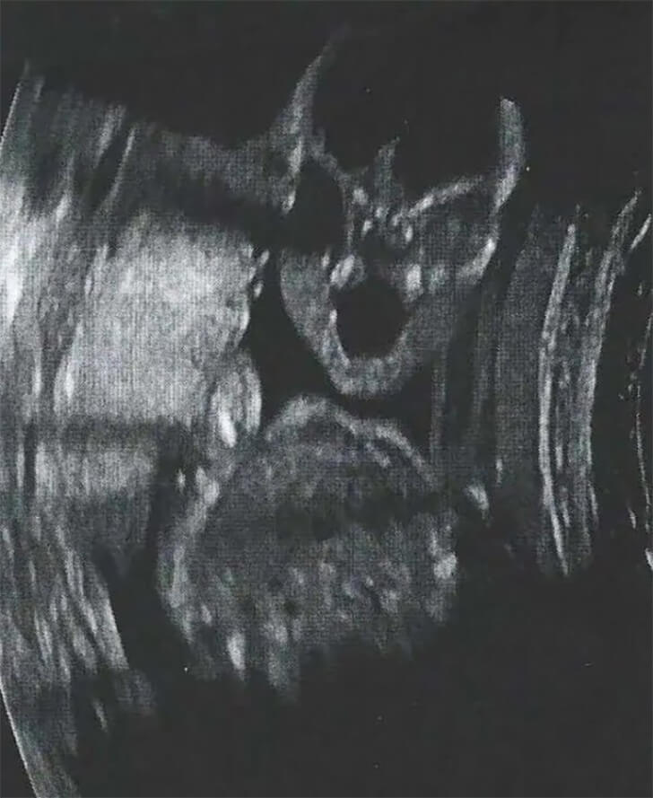 Within the eerie contours of an ultrasound image, an unsettling sight unfolds. The frontal view of a fetus, bathed in the eerie glow of medical technology, takes on a disquieting aspect. Hollow eyes, vacant yet haunting, pierce the viewer’s soul with an enigmatic stare that transcends the boundaries of the womb.