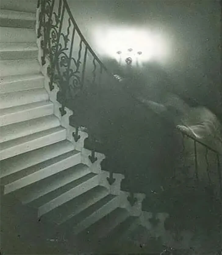 A photograph unveils a descent into the unknown in the eerie depths of a dimly lit, spiraling staircase. Against a backdrop cloaked in impenetrable darkness, an unearthly presence materializes. Shrouded in obscurity, this enigmatic entity clings to the ornate railing with gnarled fingers, its countenance a haunting blur.
