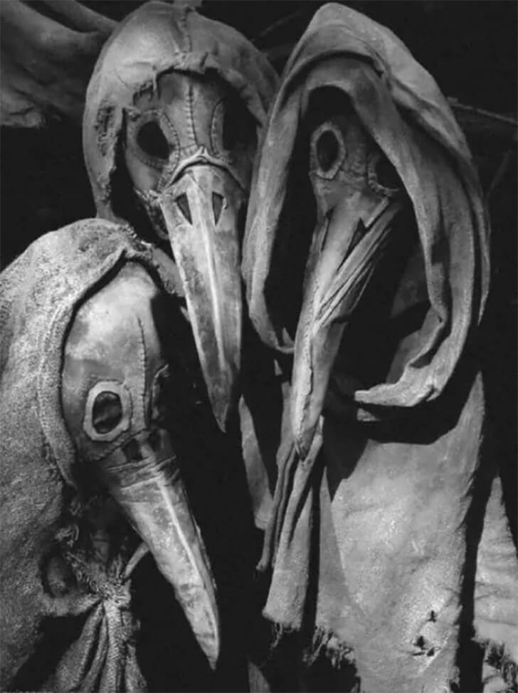 The trio stands in solemn unison, facing the camera, their faces hidden behind these sinister and menacing masks. Draped in shadowy attire, they exude an aura of eerie mystique, prompting us to ponder their purpose and intent. Is this a surreal nod to the historical guardians against disease or perhaps a chilling costume party?