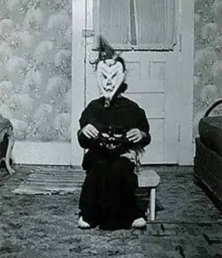 In a vintage childhood photograph, a young boy dons an eerie devil costume, creating a haunting visual contrast. Seated stoically in a chair before a closed door, his gaze pierces the lens with an unsettling intensity. The devilish ensemble comprises a mask adorned with horns and a sinister robe, embodying youthful innocence cloaked in the macabre.