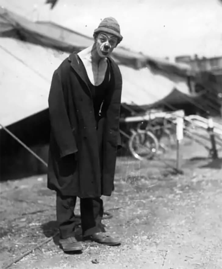 In a disquieting image, a towering figure emerges, draped in oversized, baggy clothes and comically large shoes. This peculiar character wears clown makeup, and his exaggerated sully cheeks and deep wrinkles lend an eerie, almost grotesque quality to his appearance.