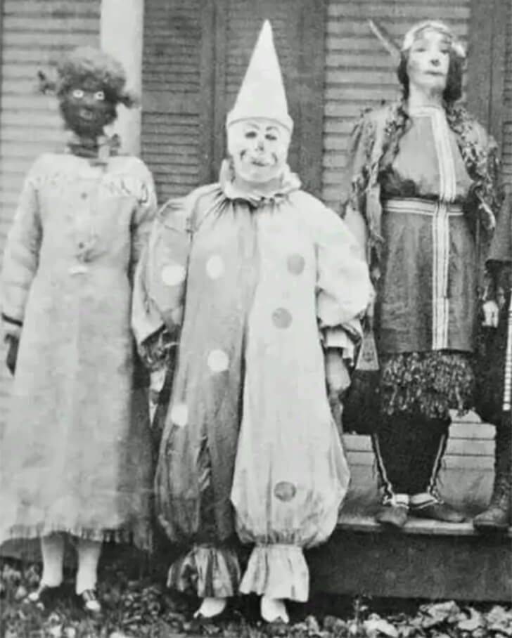 The Halloween tableau remains a captivating study in contrasts, even if modern, innovative costumes were missing in the past. Amidst the grayscale palette, the figure at the center, dressed as a clown, exudes a timeless sense of whimsy. To the right, the individual in native attire carries a solemnity that transcends color.