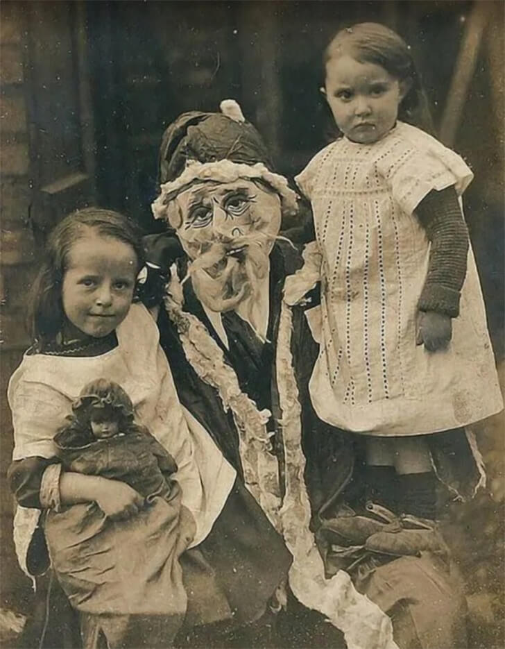 Two girls share an unsettling moment with a rather peculiar Santa Claus. One girl sits on his lap while the other perches on his thigh. The Santa costume is a far cry from the traditional jolly figure, with a face crudely drawn on, giving off an eerie and unnerving expression.