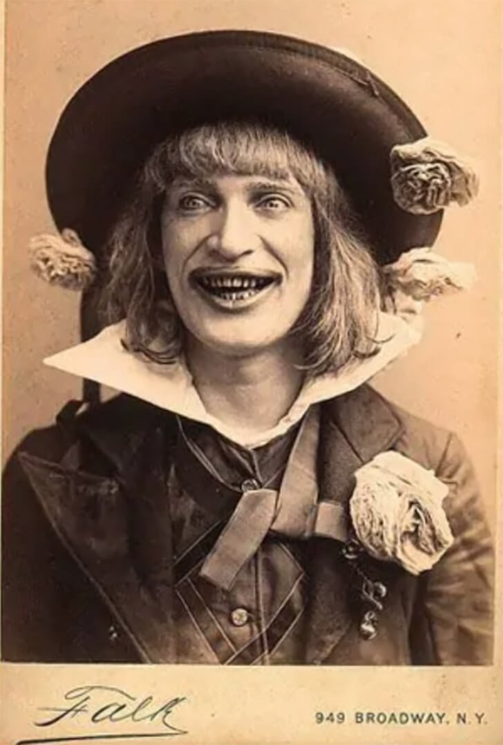 In a haunting photograph, a woman with bulging, unnaturally wide eyes takes center stage. Her lips, meticulously overlined with lipstick, form a smile that sends shivers down the spine—a smile that seems almost too wide, too perfect, too unsettling.