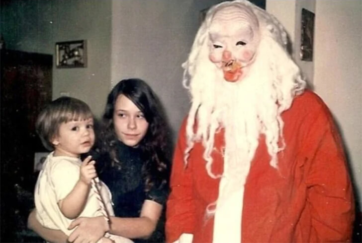 Beside this unsettling figure, a normally dressed woman clutches a trembling little boy, her expression a haunting blend of concern and terror. She averts her gaze from the abyss of Santa’s eyes, shocked at the evil presence lurking beneath the festive facade.