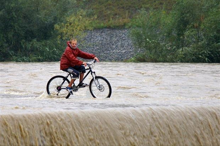 Here’s a man, bicycle and all, taking the term “off-road” to a new, potentially splashy level. Pedaling at the precipice of a waterfall, he seems to challenge the laws of physics, perhaps hoping for a hidden magical road just beyond the drop.