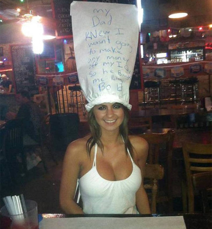 A girl rocks a mischievous grin beneath a comically oversized white hat, emblazoned with a bold declaration: “My dad knew I wasn’t going to make any money off my IQ so he bought me a big chest instead.” Why the audacious headgear? Well, it’s a witty nod to her penchant for playful self-awareness.