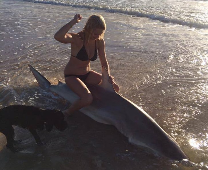 Caught on camera: a woman in a black bikini making a bold fashion statement atop a beached shark, with a curious black dog turning up for a sniff test. Sharks on the shore stir a mix of awe and caution. While it’s a rare beach day accessory, a washed-up shark could still pose dangers, especially if it decides the beach isn’t its scene.