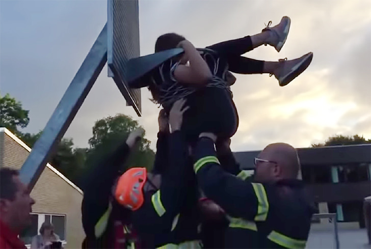 In an unexpected twist, emergency services, decked out in firefighter and EMS gear are playing a different kind of defense. Their mission? To free a girl trapped by the tenacious grip of a basketball net. How she achieved this perplexing entanglement remains a mystery worthy of sports history.